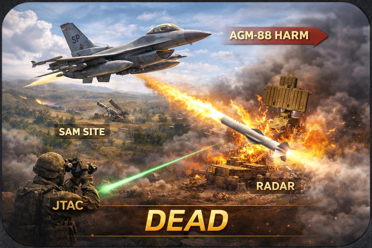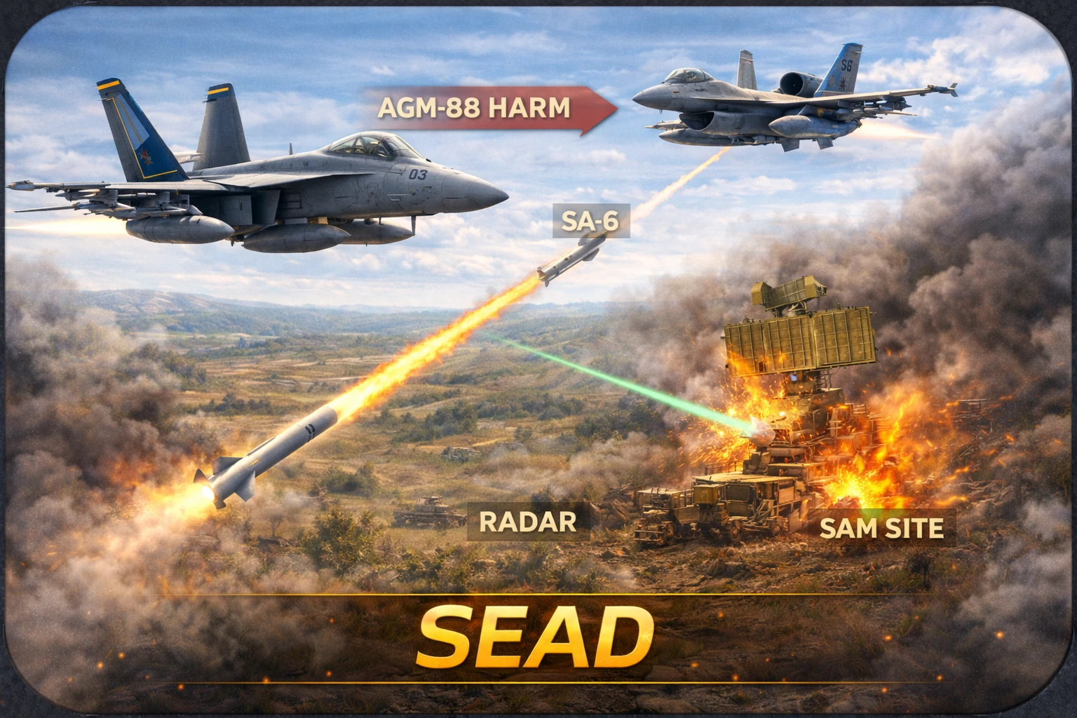 SEAD (Suppression of Enemy Air Defenses) polega na czasowym neutralizowaniu systemów obrony przeciwlotniczej przeciwnika. Piloci wykorzystują specjalne uzbrojenie, takie jak pociski przeciwradarowe AGM-88 HARM, aby zmusić radary do wyłączenia lub ograniczyć ich działanie. Dzięki temu inne samoloty mogą bezpieczniej wykonywać swoje zadania bojowe.