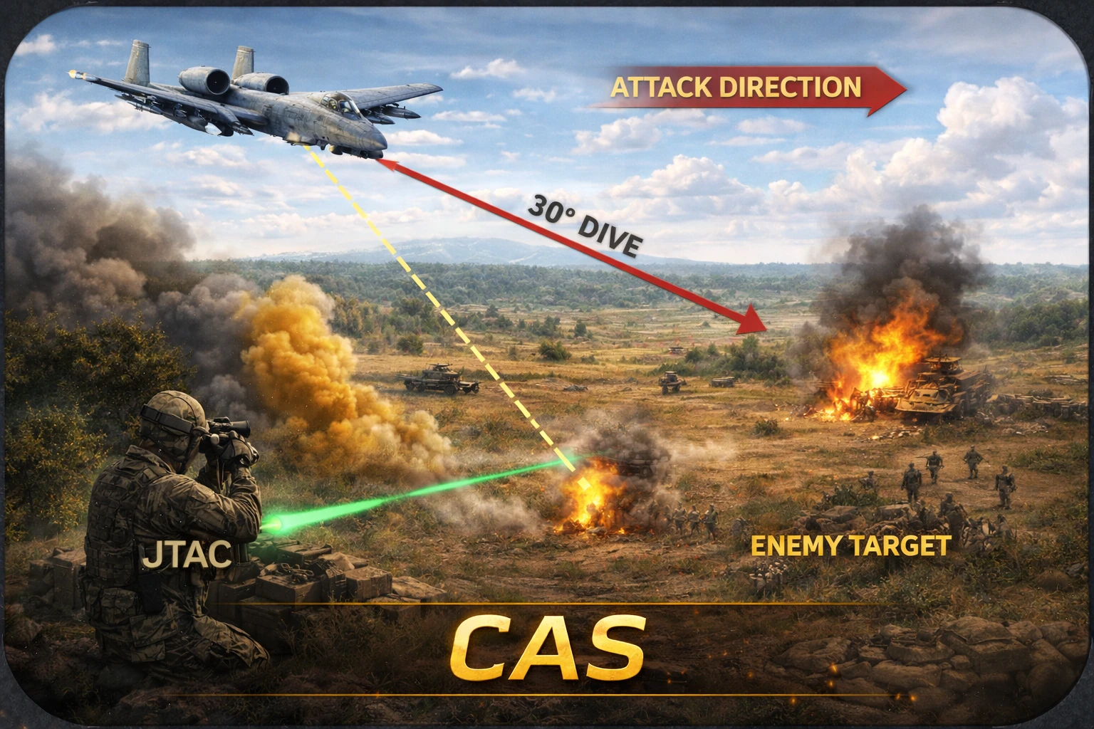 CAS (Close Air Support) to bezpośrednie wsparcie wojsk lądowych przez lotnictwo. Piloci atakują cele znajdujące się w pobliżu własnych oddziałów, dlatego działania są ściśle koordynowane z JTAC. Wymaga to precyzyjnego użycia uzbrojenia oraz dokładnej identyfikacji celu, aby uniknąć zagrożenia dla własnych sił.