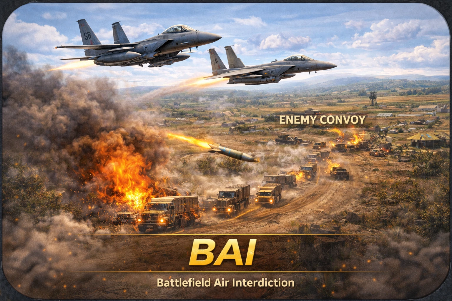 BAI (Battlefield Air Interdiction) polega na zwalczaniu sił przeciwnika na zapleczu pola walki. Celem są kolumny pojazdów, konwoje logistyczne, magazyny zaopatrzenia oraz inne elementy wspierające działania wojsk na froncie. Zadaniem pilotów jest osłabienie zdolności przeciwnika do prowadzenia walki zanim jego jednostki dotrą na linię frontu.