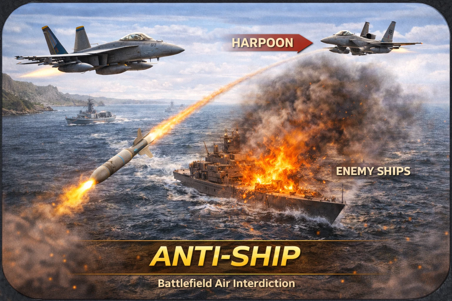 Misje Anti-Ship polegają na zwalczaniu jednostek nawodnych przeciwnika. Piloci wykorzystują pociski przeciwokrętowe oraz bomby kierowane do atakowania okrętów wojennych i transportowych. Operacje te wymagają precyzyjnego podejścia do celu oraz często prowadzone są w środowisku zagrożonym przez obronę przeciwlotniczą okrętów.